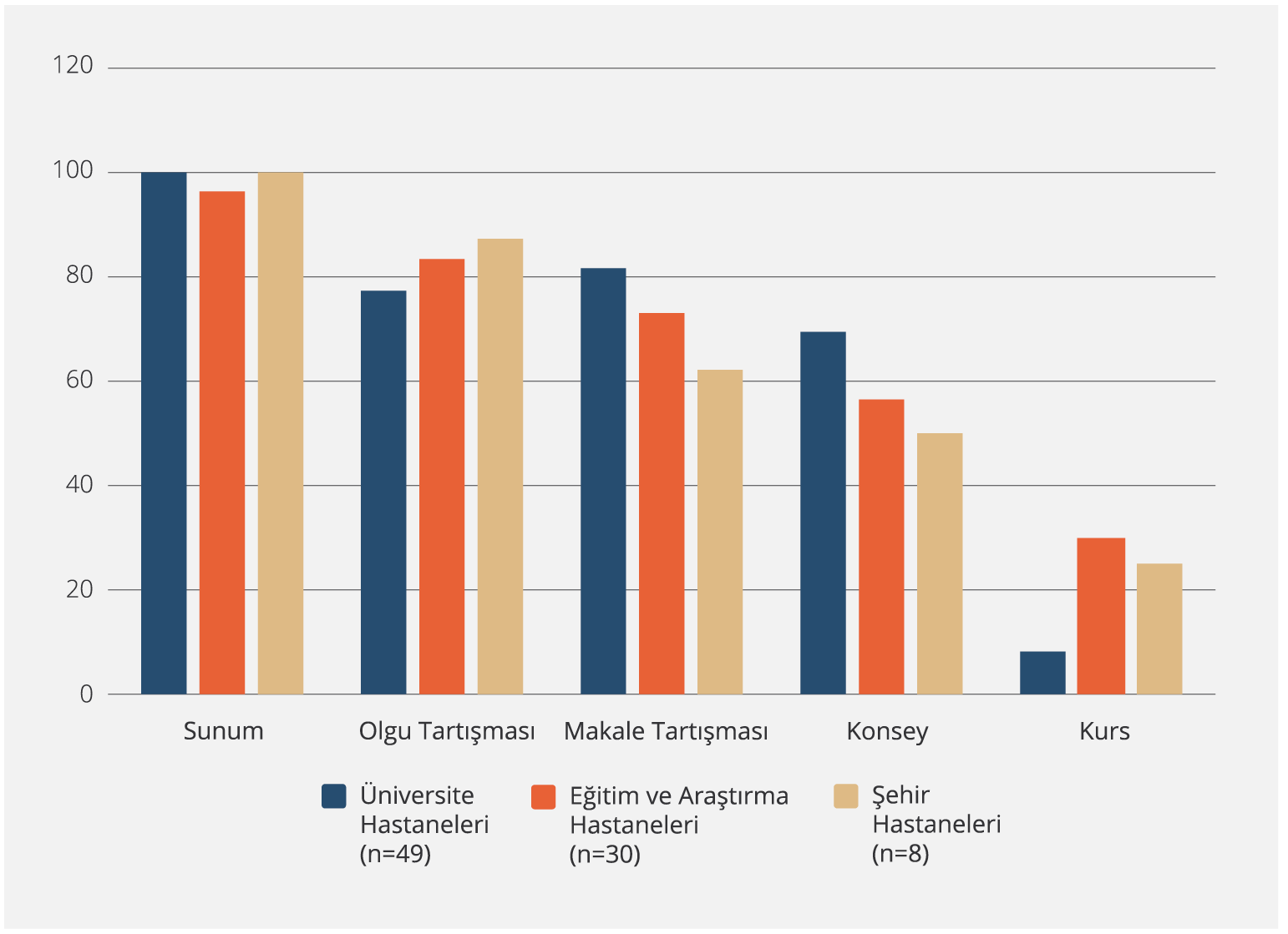 Türkiye’de yapılan çalışmalarda asistan hekimlerin en büyük sorununun eğitim yetersizliği olduğu görülmüştür (11,18). Çalışmamızda sunum ve olgu tartışmasının en çok uygulanan eğitim etkinlikleri olduğu, buna karşın kurs, araştırma ve laboratuvar alanında gerçekleştirilen uygulamalı eğitimlerin ise en az uygulanan eğitim etkinlikleri olduğu tespit edildi. Avrupa genelinde yapılan bir çalışmada da İHKM asistanlarının uygulamalı eğitim fırsatlarının istenenden daha sınırlı olduğu bildirilmiştir (6). Bu bulgular, asistan hekimlerin eğitim süreçlerinde uygulamaya yönelik etkinliklerin görece geri planda kaldığını ve eğitimin ağırlıklı olarak teorik düzeyde yürütüldüğünü düşündürmektedir. Bununla birlikte çalışmamız, makale tartışmasının üniversite hastanelerinde şehir hastanelerine kıyasla daha yaygın olarak yapıldığını göstermektedir. Bu durum, üniversite hastanelerinin akademik odaklı yapısı ve literatür tartışmalarına ayrılan zamanın daha fazla olması ile ilişkilendirilebilir. Öte yandan, şehir hastanelerinde kurs etkinliklerinin daha yaygın olarak bildirilmesi, bu hastanelerin eğitim programlarını çeşitlendirme çabalarıyla bağlantılı olabilir.